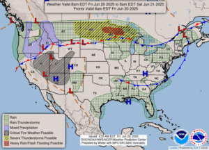Our 9:15 AM temperature is 69°F, the humidity is 85%, and winds are from the SSW at 2-6 mph. The pressure is 29.95 in and steady. Skies are cloudy and the dew point is 63°F. Visibility is 10 miles. Yesterday’s high was 77°F and the overnight low was 60°F. Average temps for this date are 80°F/57°F. Record temps for June 19 are 96°F (1995) and 43°F (2022). Sunrise was at 5:57 AM and sunset will be at 9:18 PM.