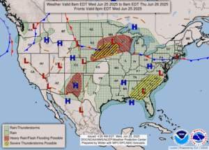 Our 1:151 PM temperature is 75°F, the humidity is 78% and skies are overcast. The pressure is 30.16 and steady. The dew point is 66°F and visibility is 10 miles. Winds are from the NNE at 2-5 mph. Yesterday’s high was 92°F and the overnight low was 67°F. Average temps for this date are 81F°/58°F. Record temps for June 24 are 95°F (1934) and 42°F (1979). Sunrise was at 5:58 AM and sunset will be at 9:19 PM.