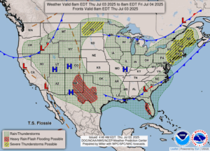Independence Day: Sunny with highs in the upper 80s. A popup shower or thunderstorm is possible. Winds light and variable. Chance of rain 15%.