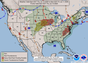 Our 1:15 PM temperature is 77°F, the humidity is 73%, and skies are cloudy. Winds are from the NW at 3-7 mph, and the pressure is 29.94 in and rising. The dew point is 68°F and visibility is 15 miles. Yesterday’s high was 83°F and the overnight low was 67F. Average temps for this date are 82°F/60°F. Record temps for July 9 are 105°F (1936) and 42°F (1963). Sunrise was aat 6:07 AM and sunset will be at 9:16 PM.