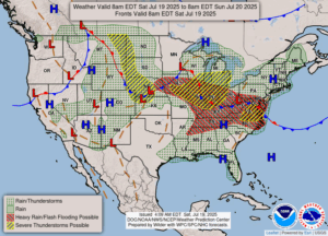 Today: Increasing clouds and humidity. Heavy to severe thunderstorms are possible this afternoon and flash flooding. Winds SSW at 5-10 mph gusting higher at times. Highs in the low 80s. Chance of rain 50%.