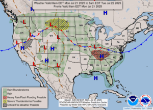 Our 11:15 AM temperature is 71°F, the humidity is 69%, and winds are from the ENE at 2-4 mph. The pressure is 30.07 in and rising, and visibility is 10 miles. The dew point is 58°F. Yesterday’s high was 79°F and the overnight low was 57°F. Average temps for this date are 82°F/60°F. Record temps for July 20 are 102°F (1930) and 41°F (1965). Sunrise was at 6:17 AM and sunset will be at 9:09 PM.