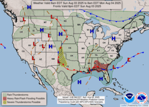 Our 2:15 PM temperature is 80°F, the humidity is 45% and winds are from the NNE at 2-5 mph. The pressure is 30.04 in and falling. The dew point is 56°F and visibility is 8 miles. Yesterday’s high was 77°F and the overnight low was 56°F. Average temps for this date are 81°F/60°F. Record temps For August 2 are 97°F (1969) and 42°F (1927). Sunrise was at 6:30 AM and sunset will be at 8:56 PM.