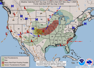 Our 11:45 AM temperature is 86°F, the humidity is 63%, and winds are from the SSW at 2-10 mph.  Skies are mostly clear and the pressure is 29.93 in and steady.  The dew point is 72°F and visibility is 10 miles.  Yesterday’s high was 92°F and the overnight low was 74°F.  Average temps for this date are 81°F/59°F.  Record temps for August 9 are 96°F (1934) and 39°F (1964).  Sunrise was at 6:37 AM and sunset will be at 8:45 PM.