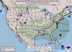 Our 12:30 PM temperature is 66°F, the humidity is 85%, and skies are cloudy. Winds are from the SSE at 2-7 mph, and the pressure is 30.03 in and steady. The dew point is 60°F and visibility is 10 miles. Yesterday’s high was 73°F and the overnight low was 63°F. Average temps for this date are 80°F/58°F. Record temps for August 19 are 96°F (2007) and 41°F (1998). Sunrise was at 6:47 AM and sunset will be at 8:31 PM.