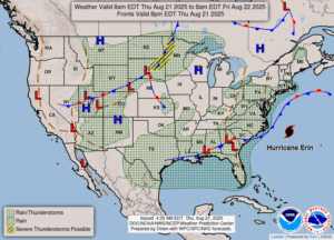 Our 2 PM temperature is 73°F, the humidity is 69%, and skies are overcast.  Winds are from the NE at 0-5 mph and the pressure is 30.06 in and falling.  The dew point is 60°F and visibility is 10 miles.  Yesterday’s high was 72F and the overnight low was 61°F.  Average temps for this date are 80°F/58°F.  Record temps for August 20 are 88°F  (2010) and 44°F (2008).  Sunrise was at 6:50 A and sunset will be at 8:30 PM.