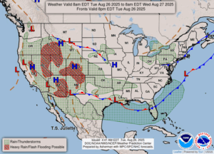 Our 12:30 PM temperature is 66°F, the humidity is 46%, and skies are partly cloudy. The pressure is 30.10 in and rising. The dew point is 44°F and visibility is 10 miles. Winds are from the WNW at 6-9 mph. Yesterday’s high was 69°F and the overnight low was 46°F. Average temps for this date are 79°F/57°F. Record temp for August 25 are 92°F (2020) and 43°F (2017.