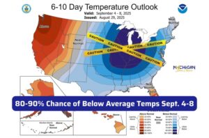 Our 4:15 PM temperature is 65°F, the humidity is 90% and skies are overcast with light rain. Winds are from the SW at 2-7 mph. The pressure is 29.37 in and steady. The dew point is 59°F and visibility is 9 miles. Yesterday’s high was 79°F and the overnight low was 53°F. Average temps for this date are 77°F/55°F. Record temps for Sept 2 are 91°F (2011) and 41°F (2017). Sunrise was at 7:04 AM and sunset will be at 8:09 PM.