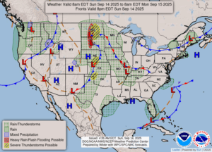 Our 2:45 PM temperature is 81°F, the humidity is 43%, and skies are mostly clear. Winds are from the east at 1-5 mph, and the pressure is 30.25 in and steady. The dew point is 56°F and visibility is 11 miles. Yesterday’s high was 80°F and the overnight low was 51F. Average temps for this date are 75°F/52°F. Record temp for Sept. 13 are 91°F (2015) and 42°F (2055). Sunrise was at 7:15 AM and sunset will be at 7:47 PM.