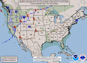 Our 8:30 PM temperature is 78°F, the humidity is 27%, and skies are filled with cirrus clouds which aren’t hampering the sun at all. Winds are from the SE at 3-7 mph, and the pressure is 30.22 in and falling. Yesterday’s high was 74°F and the overnight low was 40F. Average temps for this date are 66°F/46°F. Record temps for Oct. 1 are 80°F (2025) and 30F (2009). I think we’ll be seeing record high temps a few times over the next week. Sunrise was at 7:35 AM and sunset will be at 7:17 PM.