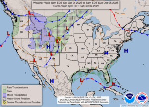 Our 6:45 PM temperature is 85°F, the humidity is 50% and winds are from the SSE at 0-5 mph.  The pressure is 30.01 in and falling.  The dew point is 55°F and visibility is 15 miles.  Yesterday’s high was 87°F, a record breaker, and the overnight low was 56°F.  Record temps for Oct. 3 are 87°F (2025) and 31°F (2003).  Average temps for this date are 65°F/46°F.   Sunrise was at 7:37 AM and sunset will be at 7:13 PM.