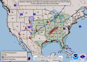 Our 1:45 PM temperature is 82°F, the humidity is 48%, and winds are from the SW at 5-13 mph, and the pressure is 29.99 in and falling. The dew point is 59°F and visibility is 11 miles. Yesterday’s high was 88°F and the overnight low was 63°F. Average temps for this date are 65°F/45°F. Record temps for Oct. 5 are 88°F (yesterday) and 26°F (2004). Sunrise was at 7:40 AM and sunset will be at 7:10 PM.