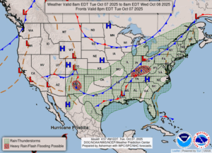 Our 2 PM temperature is 55°F, the humidity is 89% and skies are overcast and the rain seems to be over. Winds are from the NW at 0-5 mph and the pressure is 29.94 in and falling. The dew point is 49°F and visibility is 10 miles. Yesterday’s high was 85°F and the overnight low was 55°F. Average temps for this date are 63°F/44°F. Record temps for Oct. 6 are 87°F (2007) and 28°F (2003). Sunrise was at 7:41 AM and sunset will be at 7:08 PM.