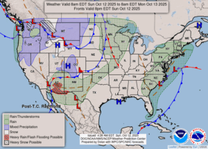 Our 12 noon temperature is 60°F, the humidity is 78%, and skies are clear. Winds are from the east at 2-5 mph, and the pressure is 29.93° in and steady. The dew point is 53°F and visibility is 10 miles. Yesterday’s high was 63°F and the overnight low was 39°F. Average temps for this date are 62°F/41°F. Record temps for Oct.11 are 79°F (2003) and 28°F (2009). Sunrise was at 7:47 AM and sunset will be at 6:59 PM.