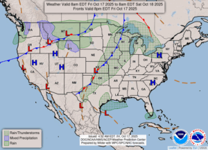 Our 1 PM temperature is 66°F, the humidity is 47%, and winds are from the SSW at 2-8 mph. Skies are mostly cloudy and the dew point is 41°F. The pressure is 29.77 in and falling and visibility is 13 miles. Yesterday’s high was 64°F and the overnight low was 42°F. Average temps for this date are 59°F/42°F. Record temps for Oct. 16 are 71°F (2016) and 29°F (2020). Sunrise was at 7:53 AM and sunset will be at 6:51 PM.