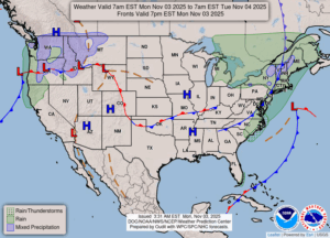 Our 11:30 AM temperature is 54°F, the humidity is 66% and the pressure is 29.81 in and rising. Winds are from the WSW at 10-17 mph. The dew point is 41°F and visibility is 11 miles. Yesterday’s high was 56°F and the overnight low was 45°F. Average temps for this date are 52°F/37°F. Record temps for Nov. 2 are 73°F (2016) and 17°F (2014).