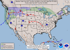 Our 11 AM temperature is 55°F, the humidity is 48%, and winds are from the WSW at 5-11 mph. The pressure is 30.06 in and steady. Skies are mostly clear and the dew point is 35°F. Visibility is 11 miles. Yesterday’s high was 58°F and the over night low was 40°F. Average temps for this date are 52°F/36°F. Record temps for Nov. 3 are 73°F (2015) and 22°F (2014). Sunrise was at 7:15 AM and sunset will be at 5:26 PM.