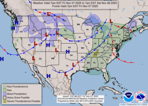 Our 12:30 PM temperature is 51°F, the humidity is 90%, and skies are overcast.  Winds are from the SW at 5-14 mph.  The pressure is 29.44 in and falling.  The dew point is 47°F and visibility is 10 miles.  Yesterday’s high was 51°F and the overnight low was 42F.  Average temps for this date are 55°F/36°F.  Record temps for Nov.6 are 72°F (2008) and 23°F (2018).  Sunrise was at 7:19 AM and sunset will be at 5:22 PM.