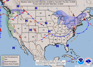 Our 1:30 temp is 47°F, the humidity is 60%, and winds are from the west at 4-18 mph, and the pressure is 29.76 in and rising. The dew point is 33°F and visibility is 11 miles. Yesterday’s high was 37°F and the overnight was 37°F. Average temps for this date are 49°F/34°F. Record temps for Nov. 11 are 77°F (2020) and 15°F (2017). Sunrise was at 7:25 AM and sunset will be at 5:17 PM.