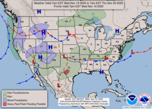 Our 2:45 PM temperature is 44F, the humidity is 56%, and winds are from the NW at 0-4 mph. The pressure is 30.67 in and steady. The dew point is 27°F and visibility is 11 miles. Yesterday’s high was 40°F and the overnight low was 25°F. Average temps for this date are 45°F/32°F. Record temps for Nov. 18 are 65°F (2016) and 10°F (2014). Sunrise was at 7:33 AM and sunset will be at 5:09 PM.