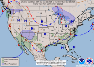 Our 4 PM temperature is 44°F, the humidity is 53% and skies are partly cloudy. Winds are from the SW at 3-7 mph, and the pressure is 30.40 in and falling. The dew point is 26°F and visibility is 13 miles. Yesterday’s high was 51°F and the overnight low was 24°F. Average temps for this date are 44°F / 30°F. Record temps for Nov. 21 are 64°F (2020) and 2°F (2014). Sunrise was at 7:38 AM and sunset will be at 5:08 PM.