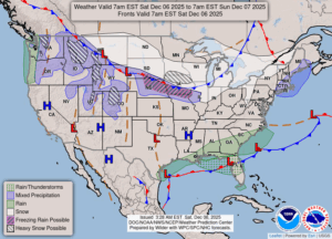 Our 1:15 PM temperature is 31°F, the humidity is 68%, and winds are from the west at 6-11 mph. Skies are cloudy and the pressure is 30.04 in and rising. The dew point is 20°F and visibility is 10 miles. Yesterday’s high was 29°F and the overnight low was 29°F. Average temps for this date are 38°F/25°F. Record temps for Dec. 5 are 55°F (2017) and -5°F (2025). Sunrise was at 7:53 AM and sunset will be at 5:03 PM.