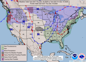 Our 1:30 PM temperature is 44°F, the humidity is 76%, and winds are from the south at 5-9 mph. Skies are overcast with light rain and the pressure is 29.26 in and falling. The dew point is 47°F and visibility is 9 miles. Yesterday’s high was 44°F and the overnight low was 33°F. Record temps for Dec. 17 are 61°F (2021) and 5°F (2010). Sunrise was at 8:03 AM and sunset will be at 5:04 PM.