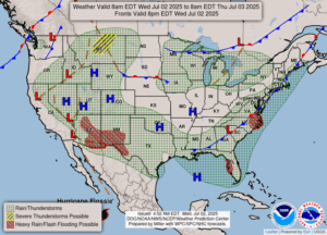 Our 1:30 PM temperature is 85°F, the humidity is 52%, and the dew point is 62°F. Winds are from the west at 4-7 mph and the pressure is 29.89 and falling. Visibility is 16 miles. The UV Index is very high at 9. Yesterday’s high was 85°F and the overnight low was 66°F. Normal temps for this date are 82°F/59°F. Record temps for July 1 are 102°F (1931) and 40°F (1965). Sunrise was at 6:02 AM and sunset will be at 9:19 PM.
