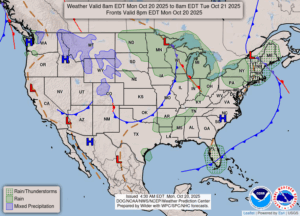 Our 12 noon temperature is 55°F, the humidity is 62%, and skies are mostly clear. Winds are from the west at 4-11 mph, and the pressure is 29.81 in and falling. The dew point is 41°F and visibility is 15 miles. Yesterday’s high was 64°F and the overnight low was 40°F. Average temps for this date are 58°F/41°F. Record temps for Oct. 19 are 78°F (2016) and 21°F (2018). Sunrise was at 7:56 AM and sunset will be at 6:45 PM.