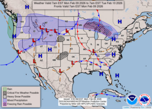Our 10:45 AM temperature is 19°F, the humidity is 67%, and skies are cloudy. Winds are from the SE at 2-5 mph, and the pressure is 30.14 in and falling. The dew point is 2°F. Yesterday’s high was 20°F and the overnight low was 4°F. Record temps for Feb. 8 is 53°F (2009) and -8°F (2026). Sunrise was at 7:41 AM and sunset will be at 6:00 AM.
