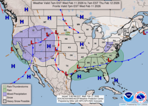 Our 2:45PM temp is 30°F, the humidity is 62% and winds are from the west at 7-12 mph, and skies are overcast. The high yesterday was 41°F and the overnight low was 30°F. Average temps for this date are 32°F/16°F. Record temps for Feb. 10 are 60°F (2024) and -5°F (2026). Sunrise was at 7:40 AM and sunset will be at 6:02 PM.
