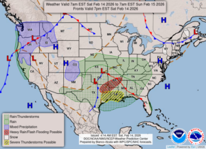 Our 12:30 PM temperature is 38°F, the humidity is 64% and skies are mostly clear with some high clouds.  Winds are from the north at 2-3 mph, and the pressure is 29.94 in and steady.  The dew point is 30°F and visibility is 8 miles.  Yesterday’s high was 43°F and the overnight low was 23°F.  Average temps for this date are 33°F/16°F.  Record temps for Feb 13 are 53°F (2023) and -15°F (2014).  Sunrise was at 7:36 AM and sunset will be at 6:06 PM.