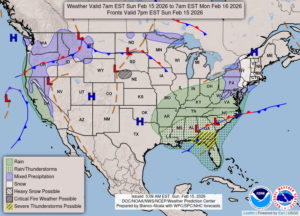 Our 2:30 PM temperature is 50°F, the humidity is 49% and winds are from the SE at 0-6 mph. The pressure is 29.73 in and falling. Skies are partly cloudy, the dew point is 30°F and visibility is 14 miles. Yesterday’s high was 44°F and the overnight low was 22°F. Average temps for this date are 33°F/16°F. Record temps for Feb. 14 are 53°F (2023) and -9°F (2022). Sunrise was at 7:34 AM and Sunset will be at 6:08 PM.