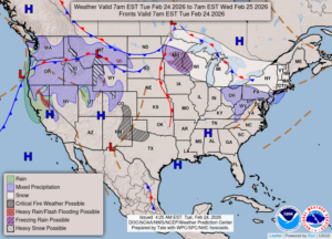 Our 4:30 PM temperature is 32°F, the humidity is 58%, and winds are from the south at 4-10 mph. The pressure is 29.42 in and falling. The dew point is 17°F and visibility is 12 miles. Yesterday’s high was 27F and the overnight low was 12F. Average temps for this date are 36°F/18°F. Record temps for Feb. 23 are 65°F (2017) and -15°F (2017). Sunrise was at 7:21 AM and sunset will be at 6:19 PM.