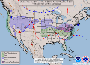 Our 1:45 PM temperature is 32°F, the humidity is 49%, and skies are clear. Winds are from the SE at 3-6 mph, and visibility is 13 miles. The pressure is 30.31 in and falling. The dew point is 14°F. Yesterday’s high was 23°F and the overnight low was 11°F. Average temps for this date are 38°F/20°F. Record temps for March 1 are 63°F (2018) and -13°F (2014). Sunrise was at 7:11 AM and sunset will be at 6:27 PM.