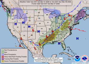 Our 12:45 PM temperature is 66°F, the humidity is 78%, and skies are overcast. Winds are from the SW at 14 to 17 mph, and the pressure is 29.51 in and falling. The dew point is 58°F and visibility is 10 miles. Yesterday’s high was 57°F and the overnight low was 56°F. Average temps for this date are 40°F/21°F. Record temps for March 6 are 65°F (2004) and -5°F (2015). Sunrise was t 7:03 AM and sunset will be at 6:33 PM.