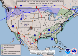 Our 12:30 PM temperature is 47°F, the humidity is 62% and skies are clear. Winds are from the SW at 7-14 mph and the pressure is 29.69 in and falling. Yesterday’s high was 67°F and the overnight low was 38F. Average temps for this date are 40°F/22°F. Record temps for March 7 at 68°F (2004) and -1°F (2015). Sunrise was at 8:01 AM and sunset will be at 7:34 PM DLT.