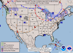 Our 5:45 PM temperature is 50°F, the humidity is 46%, and skies are partly cloudy. Winds are from the NW at 2-5 mph, and the pressure is 30.06 in and steady. The dew point is 30°F and visibility is 11 miles. Yesterday’s high was 34°F and the overnight low was 32°F. Average temps for this date are 45°F/25°F. Record temps for March 18 are 79°F (2012) and 7°F (2014). Sunrise was at 7:42 AM and sunset will be at 7:47 PM.