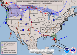 Our 1:45 PM temperature is 43°F, the humidity is 40%, and winds are from the south at 4-11 mph. The pressure is 30.33 in and steady. The dew point is 16°F and visibility is 14 miles. Yesterday’s high was 37°F and the overnight low was 19°F. Average temps for this date are 47°F/27°F. Record temps for March 23 are 80°F (2012) and 8°F (2020). Sunrise was at 7:33 AM and sunset will be at 7:53 PM.