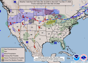 Our 4:15 PM temperature is 73F, the humidity is 39%, and skies are cloudy. Winds are from the SW at 3-11 mph, and the pressure is 29.83 in and falling. The dew point is 38F and visibility is 15 miles. Yesterday’s high was 58F and the overnight low was 30F. Average temps for this date are 50F/29F. Record temps for March 29 are 68F (2019) and 13F (2022). Sunrise was at 7:22 AM and sunset will be at 8:00 PM.