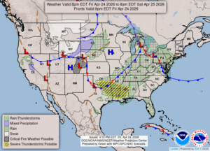 Our 5:30 PM temperature is 67°F, the humidity is 91%, and skies are overcast. Winds are from the south at 0-2 mph. The pressure is 29.59 in and rising. The dew point is 64F and visibility is 5 miles. Yesterday’s high was 86F and the overnight low was 63°F. Average temps for this date are 61°F/38°F. The record high for April 23 is 86°F (yesterday) and the record low is 25°F (20151). Sunrise was at 6:41 AM and sunset will be at 8:29 PM.